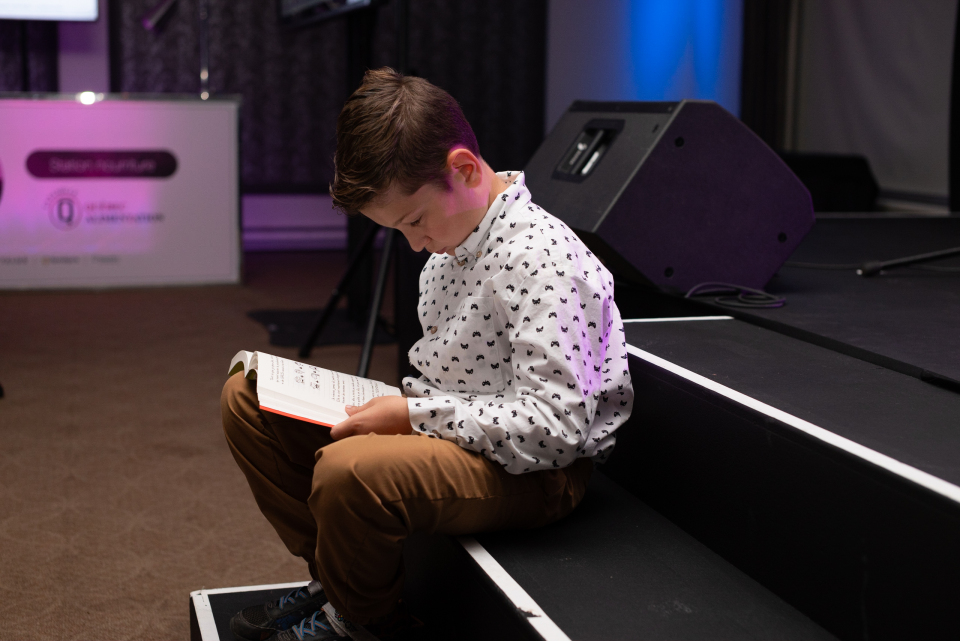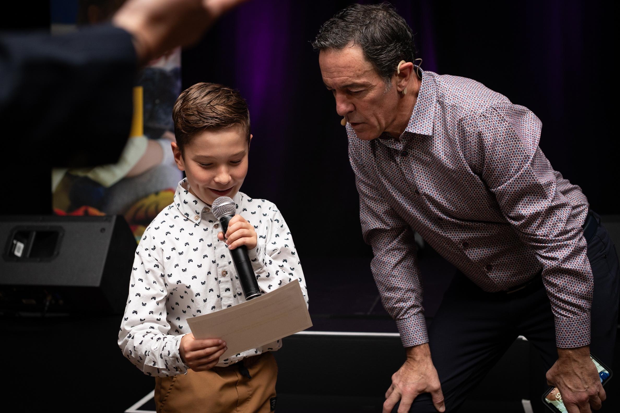 Alain was doing microphone tests and asked Loukian if he wanted to try. Loukian said yes. He went up on stage, did a quick test, said a few words, then came back down a little stressed, sticking very close to me. I asked him what was wrong, and he told me he wished he had been able to practice a full sentence.