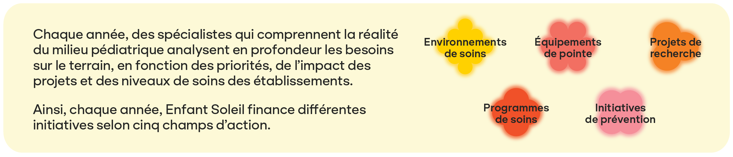 Enfant Soleil appuie plus d’une centaine d’établissements de santé à travers la province en plus d’offrir un soutien indispensable aux quatre grands centres pédiatriques, qui offrent des soins spécialisés et surspécialisés accessibles à tous les enfants qui en ont besoin.
